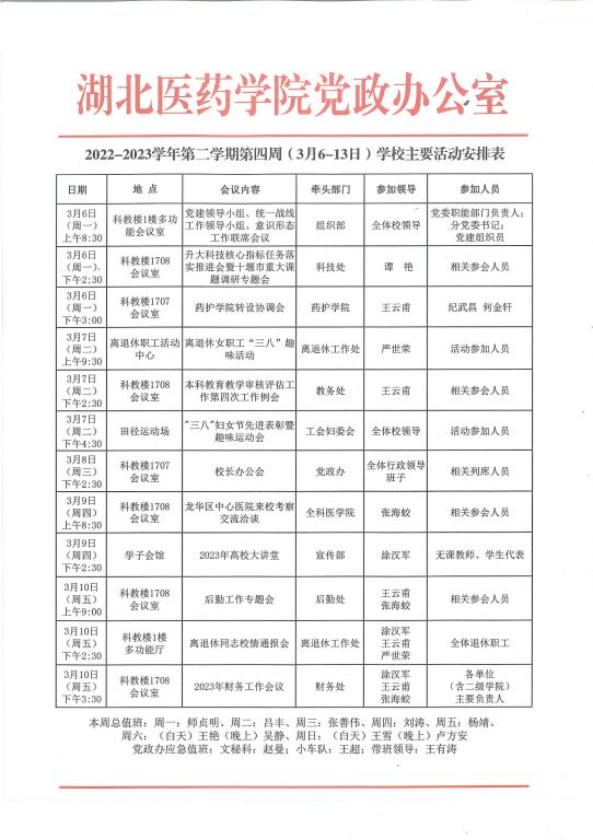 2022-2023学年第二学期第四周(3月6-13日)学校重要活动安排表