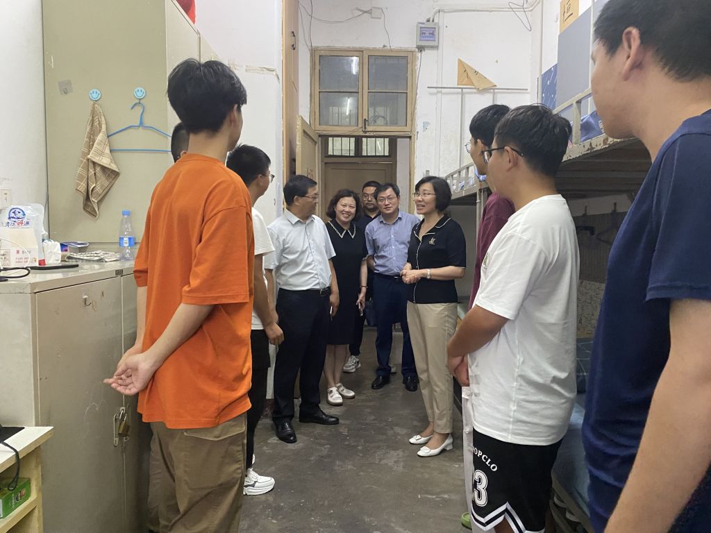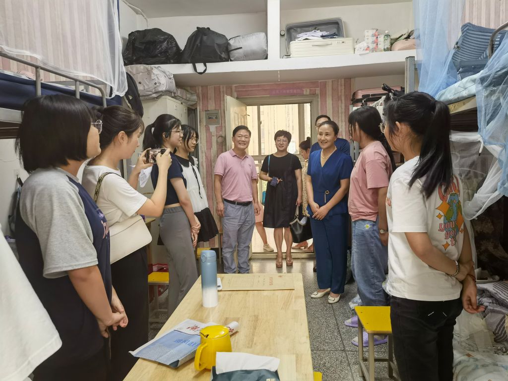 “家是哪里的?”“对学校还适应吗?”“来了之后有没有碰到什么困难?”在宿舍里,郑丹凤亲切询问新生进校感受与宿舍安排情况,详细了解宿舍设施和配套。在交谈中,她说:“机会是留给有准备的人,大家要提前做好学业规划,认真学习,笃行不怠。”走访过程中,张海蛟叮嘱新生们要严格遵守宿舍管理规定,养成良好生活习惯,加强个人卫生管理,做好个人安全保障,营造整洁高雅、健康文明的宿舍环境。