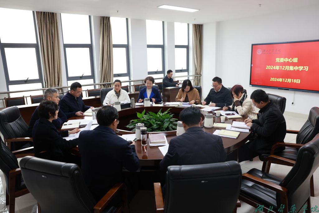 会上,党委书记郑丹凤导学习近平总书记对新时代马克思主义理论研究和建设工程作出的重要指示、《中共湖北省委关于深入学习贯彻习近平总书记考察湖北重要讲话精神、奋力谱写中国式现代化湖北篇章的决定》、中国共产党湖北省第十二届委员会第八次全体会议公报、省委书记王蒙徽关于《决定》的说明以及相关讲话。党委副书记、校长罗杰导学中央经济工作会议精神、习近平总书记关于“三农”工作和乡村振兴战略的重要论述。党委常委、纪委书记徐荣导学习近平总书记在2024年第24期《求是》杂志发表的重要文章《深入推进党的自我革命》、12月9日中共中央政治局会议精神。党委副书记、组织部部长张海蛟导学习近平同志《论教育》、习近平总书记在2024年第23期《求是》杂志发表的重要文章《必须坚持守正创新》、李干杰在党员队伍建设工作座谈会上的讲话精神。党委常委、统战部部长谭艳导学习近平总书记在中共中央政治局第十八次集体学习的重要讲话精神、12月6日习近平总书记在中共中央召开党外人士座谈会上的重要讲话精神以及教育部等七部门印发的《进一步加强尊师惠师工作的若干措施》。