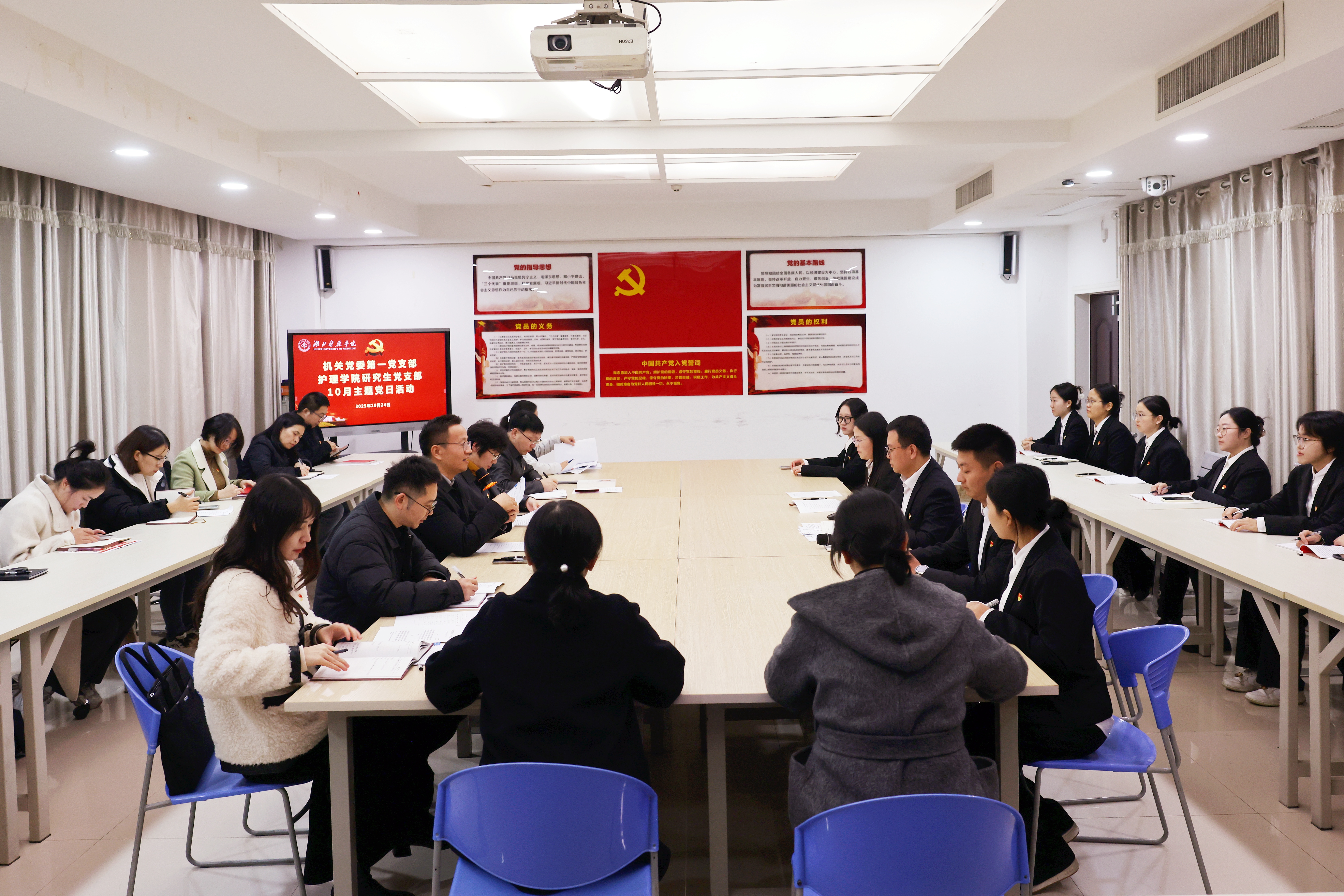 本网讯(通讯员 郑语晨)10月24日下午,机关党委第一党支部与护理学院党委研究生党支部在8号楼4楼学生党员活动室联合开展10月主题党日活动,校党委书记郑丹凤参加活动并寄语研究生党员。活动由校党委常委、宣传部部长、机关党委第一党支部书记陈建龙主持。
